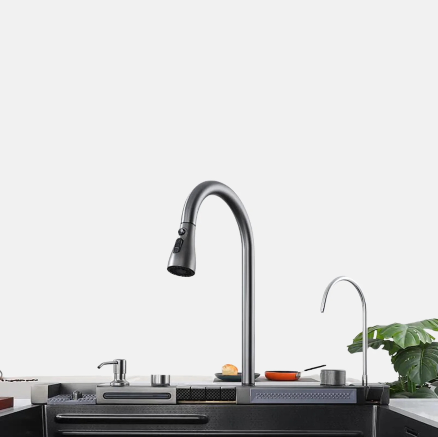 Kuhinjski sudoper s integriranim stalkom za radnu stanicu omogućuje vam da u sudoper postavite pripadajuće dodatke, pojednostavljujući pripremu hrane bez gubitka prostora na radnoj površini, a inovativni vodopadni dizajn omogućuje vam da se oprostite od modela sudopera s jednom slavinom. Olakšava čišćenje povrća, dok vašoj kuhinji daje moderan i inovativan izgled.